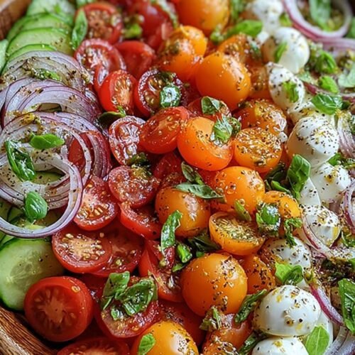 Dieser lebhafte Sommersalat mit Tomaten ist eine köstliche und leichte Mahlzeit, perfekt für heiße Tage. Die Kombination aus saftigen Tomaten, knackigem Gemüse und frischen Kräutern sorgt für ein wahres Geschmackserlebnis. Mit einem Hauch von Olivenöl und einem Spritzer Zitrone wird dieser Salat zu einem sommerlichen Genuss, der sowohl als Hauptgericht als auch als Beilage überzeugt. Das Rezept lässt sich schnell zubereiten und eignet sich hervorragend für gesunde Rezepte für 2 Tage. Besonders für alle, die vegetarische Rezepte für 2 Tage suchen, ist dieser Salat eine tolle Option. Dank seiner frischen Zutaten passt er perfekt in jedes Menü für Rezepte Abendessen 2 Tage oder Rezepte Mittagessen 2 Tage und lässt sich sogar als Rezepte ein Topf Variante vorbereiten. Ob für ein Picknick, das Büro oder ein leichtes Abendessen auf dem Balkon – dieser Sommersalat bringt Farbe und Vitamine auf den Teller und ist ein wahrer Allrounder der Sommerküche.
