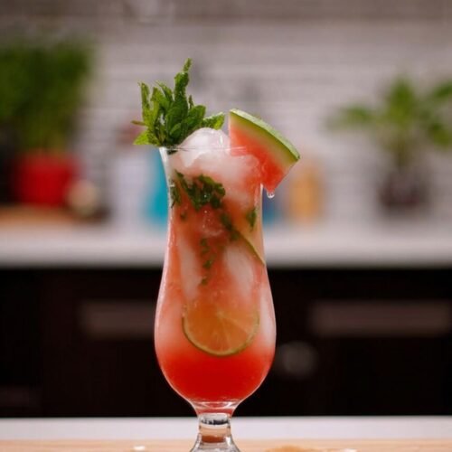 Umrühren, mit Minzzweig und Wassermelone garnieren und servieren.